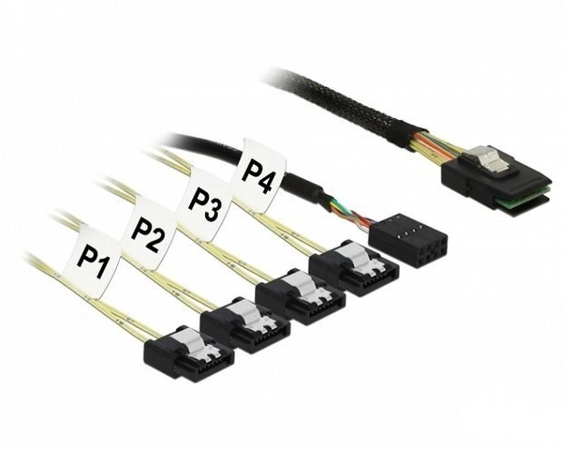 • Delock Kabel (83319) Mini SAS SFF-8087 | 4 x SATA 7 Pin Reverse + Sideband 1m. | 83319